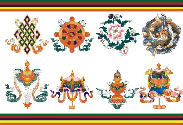 Dos Peces Dorados, la Rueda Dhrarma, la Caracola, el Nudo Sin Fin, la Bandera